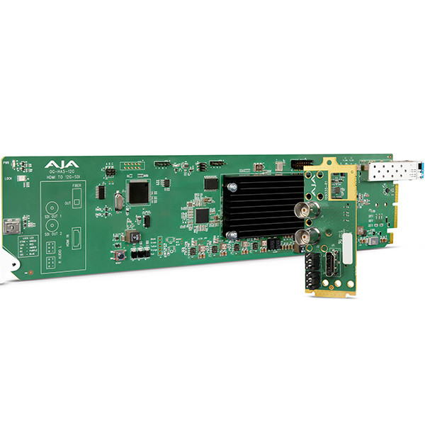 AJA’s OG-HA5-12G converts an HDMI 2.0 input to 12G-SDI for 4K/UltraHD single link outputs. OG-HA5-12G includes two 12G-SDI distribution amplifier outputs with 8 or 2-channels of embedded audio from an HDMI source.