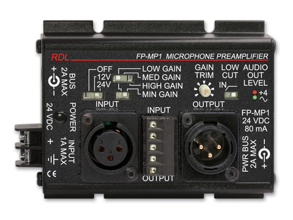 The FP-MP1 is the ideal choice in most applications requiring a preamp. RDL's exclusive low-noise discrete circuitry produces studio quality low noise performance in an economical preamplifier. The XLR and plug-in terminal block connections make the FP-MP1 perfect for both rack-mounted hardwired installations and remote use with standard audio cables. A front-panel switch permits the installer to direct phantom voltage to the input connectors. This 3-position switch provides 24V, 12V or phantom OFF. A second switch selects the input gain range thereby permitting the connection of standard or high output level microphones.