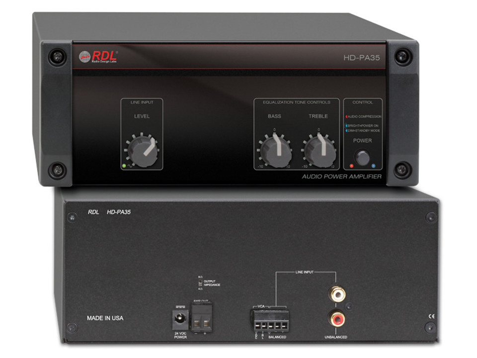 The HD-PA35 is a single input audio amplifier for systems demanding high energy efficiency. It may be used as a single zone amplifier fed from a variety of RDL or OEM mixers. It is ideal for providing one or more additional zones to a mix originating from another RDL HD series mixer amplifier. The 35 W power amplifier output is driven from a high-efficiency Class D amplifier stage. The amplifier output level may be VCA controlled using various optional RDL remote controls, or by industry standard 0 to 10 Vdc or 0 to 10 k? controls. The output drives 4 ? or 8 ? speakers. The output impedance is switch-selectable on the rear panel. The HD-PA35A has all the features of the HD-PA35 except its 35 W amplifier provides a constant voltage output (25 V, 70 V or 100 V) instead of a low impedance speaker output. The HD-PA35 is engineered and manufactured in the U.S.A.