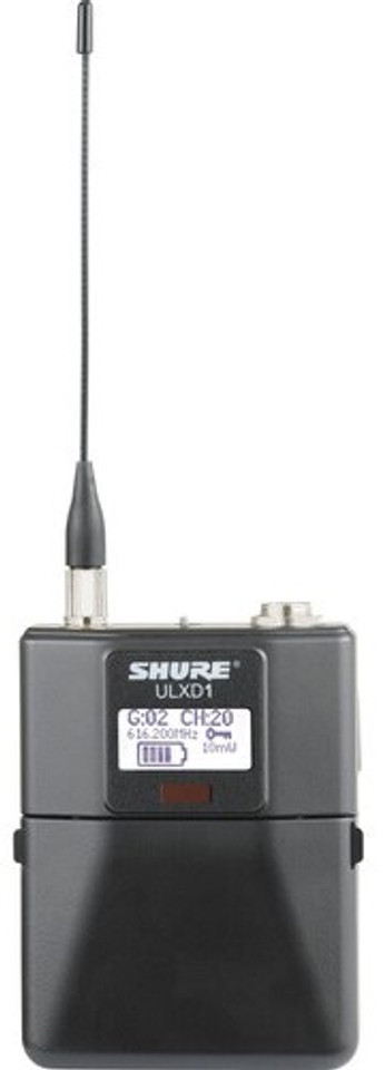 The Shure ULXD1 is a digital wireless bodypack transmitter compatible with ULX-D receivers. With rugged, yet lightweight aluminum housing, it delivers pristine audio quality and RF performance, AES 256-bit encryption for secure transmission, and advanced rechargeability options for professional sound reinforcement applications.